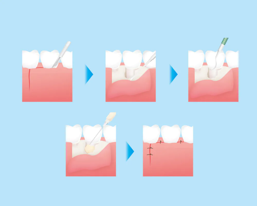 歯肉を剥離し歯根面を清掃します。ポケットの底面まで歯肉をずらして確実に取り除くため、フラップ手術よりも切除量が増え、歯が長く見えるようになる可能性があります。通常は神経のない被せの歯に対して実施します。